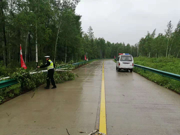 交警大隊派出警力增援北極中隊,擴大巡邏范圍,及時排查發(fā)現(xiàn)G111、G331國道、景區(qū)周邊路段交通隱患。在北極村至北紅村路段,發(fā)現(xiàn)由于暴雨沖刷,該路段3處山石、樹枝堆積在路面,2處樹木刮倒,嚴(yán)重影響路面通行安全。巡邏民警立即對險情進(jìn)行處置。針對3處漫水較為嚴(yán)重區(qū)域,設(shè)置警戒線等警示標(biāo)志,告知過往車輛通行路況,提醒車輛減速慢行,同時通知相關(guān)部門及時處置。