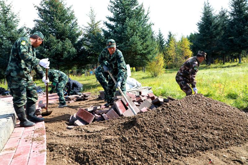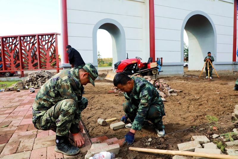 施工現(xiàn)場另一邊,林業(yè)局森林消防一大隊承擔(dān)著北極植物園酒莊大門步道磚的施工任務(wù)。通往酒莊的道路上,白色線繩將施工區(qū)域切割成規(guī)整的“豆腐塊”,隊員們在打好水穩(wěn)層的網(wǎng)格區(qū)域內(nèi)精準(zhǔn)作業(yè),確保每一塊步道磚都橫平豎直。“爸爸在山頂瞭望,守護山林,我在山下參與建設(shè),我們父子二人既是建設(shè)者,也是‘森林衛(wèi)士’,以不同的方式守護著‘美麗阿木爾’”,森防隊員梁光輝說。隊員們正在參加建設(shè),但森防給養(yǎng)、撲火機具早已裝車,一旦有火情,便能立刻投入滅火戰(zhàn)斗。