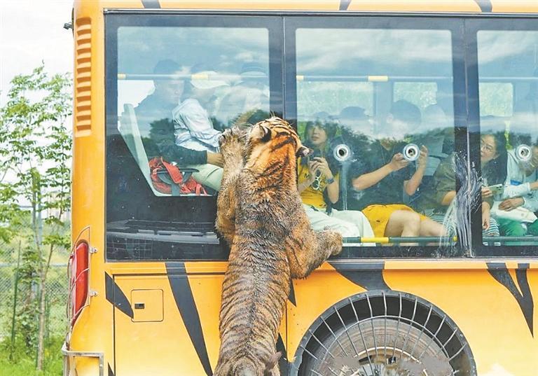 在驚險觀光車上,游客可以通過特制裝置給成年虎投喂食物,體驗“虎口投食”的刺激?!皬膩頉]想過能這么近距離接觸東北虎,看著它從我手中的夾子吃肉,既緊張又激動!”來自上海的大學生語氣難掩興奮。