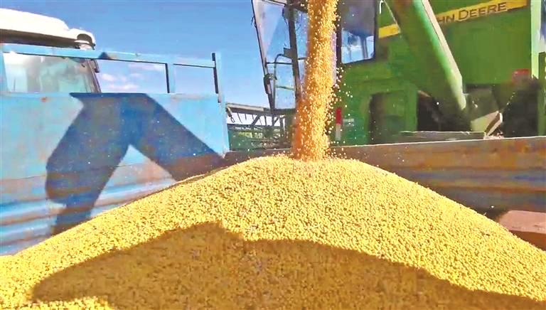 在海倫市前進鎮(zhèn)雙泉村大豆農(nóng)業(yè)示范園區(qū),1510畝核心種植區(qū)宛如一塊碩大的金色地毯,格外引人注目。大型收割機轟鳴作業(yè),將飽滿的豆莢卷入機身,留下整齊的根茬,處處是忙碌的豐收景象。采訪中記者了解到,這里是全國大豆產(chǎn)業(yè)發(fā)展的“標(biāo)桿示范區(qū)”,該園區(qū)由軍琢農(nóng)機專業(yè)合作社負責(zé)種植經(jīng)營管理,海倫市農(nóng)業(yè)技術(shù)推廣中心的科技人員常年駐守田間,從種植方案制定,到田間技術(shù)培訓(xùn),再到生產(chǎn)過程中的實時指導(dǎo),全程為大豆種植“把脈護航”。