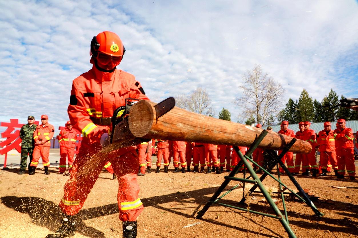 阿木爾林業(yè)局撲火專業(yè)隊(duì)員在進(jìn)行油鋸割木競(jìng)賽(王力 攝)