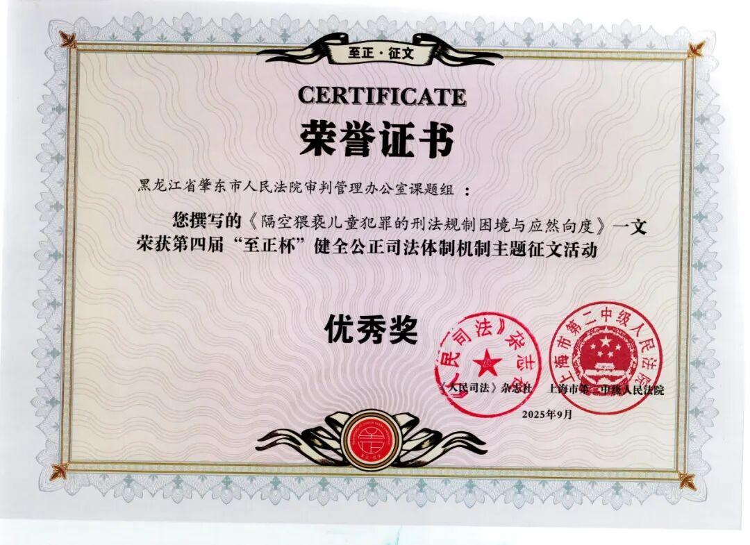 黑龍江經(jīng)濟(jì)網(wǎng)訊(董慧瑩 王岳)近日,由《人民司法》雜志社與上海市第二中級人民法院聯(lián)合舉辦的第四屆“至正杯”健全公正司法體制機(jī)制征文活動結(jié)果揭曉。本屆征文共收到投稿1500余篇,經(jīng)評委會認(rèn)真評議,共評選出一等獎5篇、二等獎15篇、三等獎50篇、優(yōu)秀獎60篇。其中,肇東市人民法院審管辦(研究室)課題組撰寫的調(diào)研論文《隔空猥褻兒童犯罪的刑法規(guī)制困境與應(yīng)然向度》榮獲優(yōu)秀獎。