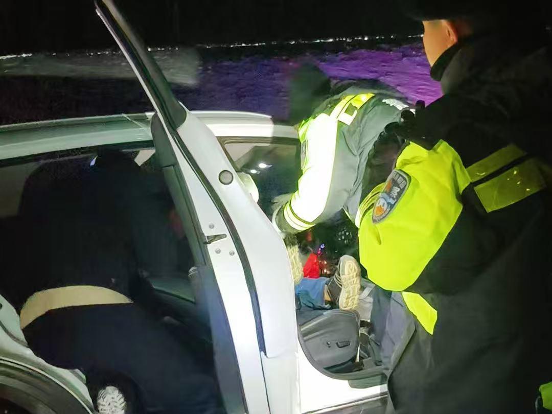 抵達(dá)現(xiàn)場(chǎng)后,民輔警第一時(shí)間查看被困人員狀態(tài),通過(guò)簡(jiǎn)單詢(xún)問(wèn),確認(rèn)無(wú)人員受傷,隨即立刻展開(kāi)低溫救援,由于溝坡陡滑,常規(guī)救援設(shè)備無(wú)法使用。民輔警毫不猶豫地滑下溝底,并迅速?gòu)母瘪{駛展開(kāi)救援,經(jīng)過(guò)不懈努力,十分鐘后成功將被困人員從車(chē)內(nèi)救出。隨后,民輔警主動(dòng)幫助聯(lián)系拖車(chē)公司將車(chē)輛送至維修廠(chǎng)檢修,并用警車(chē)將游客接回派出所安置。抵達(dá)白銀納派出所后,值班輔警遞出早已準(zhǔn)備好的熱水和蛋糕。“溫度達(dá)到零下36℃,手機(jī)凍得即將關(guān)機(jī),還好有人民警察幫忙,不然真的不知道該怎么辦了?!北痪戎罕姼屑さ恼f(shuō)道。