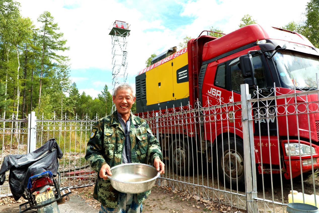“阿06”防火瞭望塔瞭望員樊學(xué)春端著剛打出來(lái)的水,笑得合不攏嘴(王力 攝)