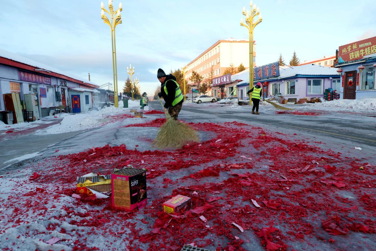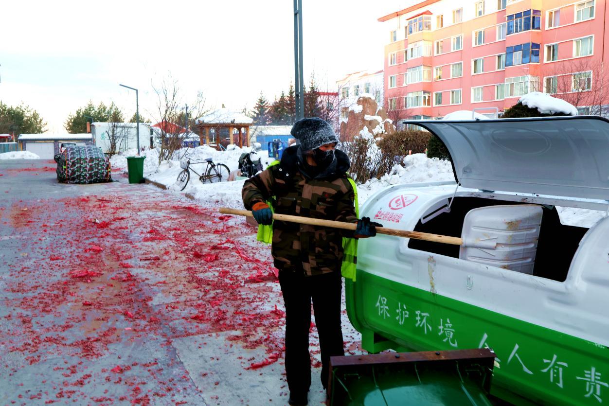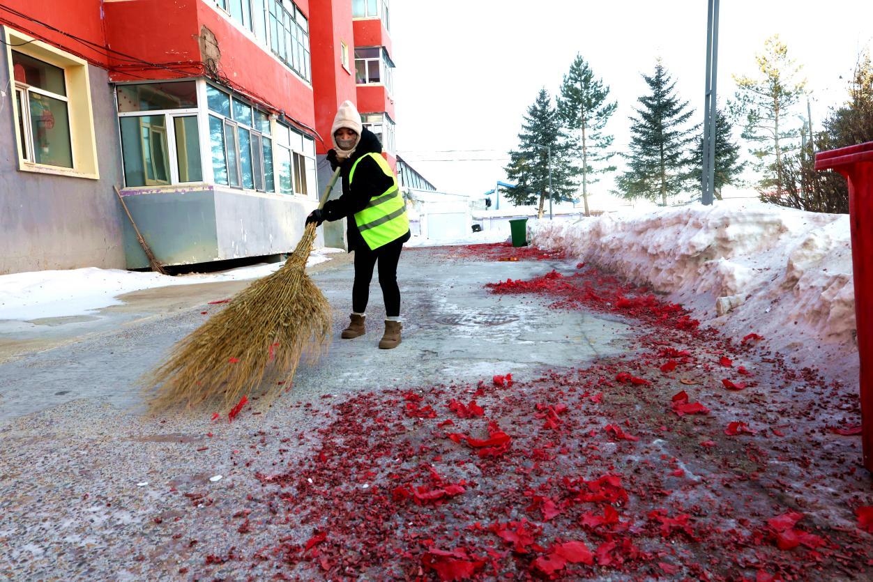 2月16日8點,大街小巷年味正濃,鞭炮紙屑散落各處,行人寥寥。身穿黃馬甲的林業(yè)局環(huán)衛(wèi)工人已穿梭在街頭,帽子、睫毛凝滿白霜,手中掃帚不停揮舞,將鞭炮碎屑、生活垃圾及時清掃歸堆、裝車清運。轉崗環(huán)衛(wèi)工人馬建民說:“我的責任區(qū)內(nèi)商戶多、居民多,春節(jié)期間工作量比平時多一倍,必須打掃干凈,讓大家過個舒心年?!痹谌w保潔員的奮戰(zhàn)下,居民區(qū)實現(xiàn)鞭炮紙屑隨放隨清、生活垃圾日產(chǎn)日清,大街小巷始終整潔有序。
